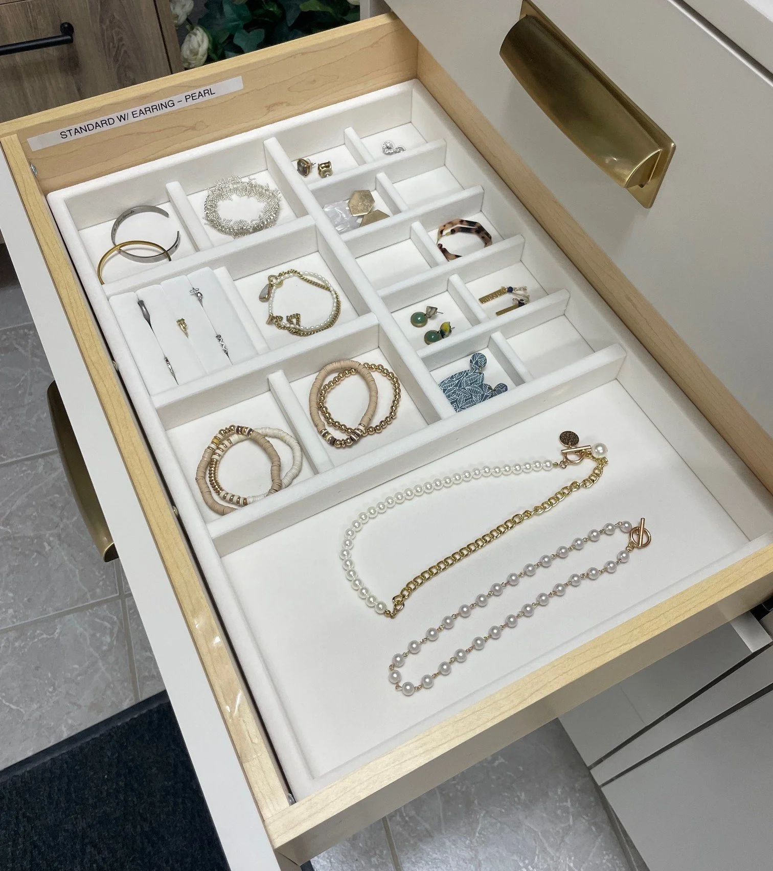Takeaway: Our designers love to accessorize the insides of your drawers! Whether it’s jewelry tray inserts, silverware organizers, or angled spice drawers, they are ready to implement their storage solution ideas!